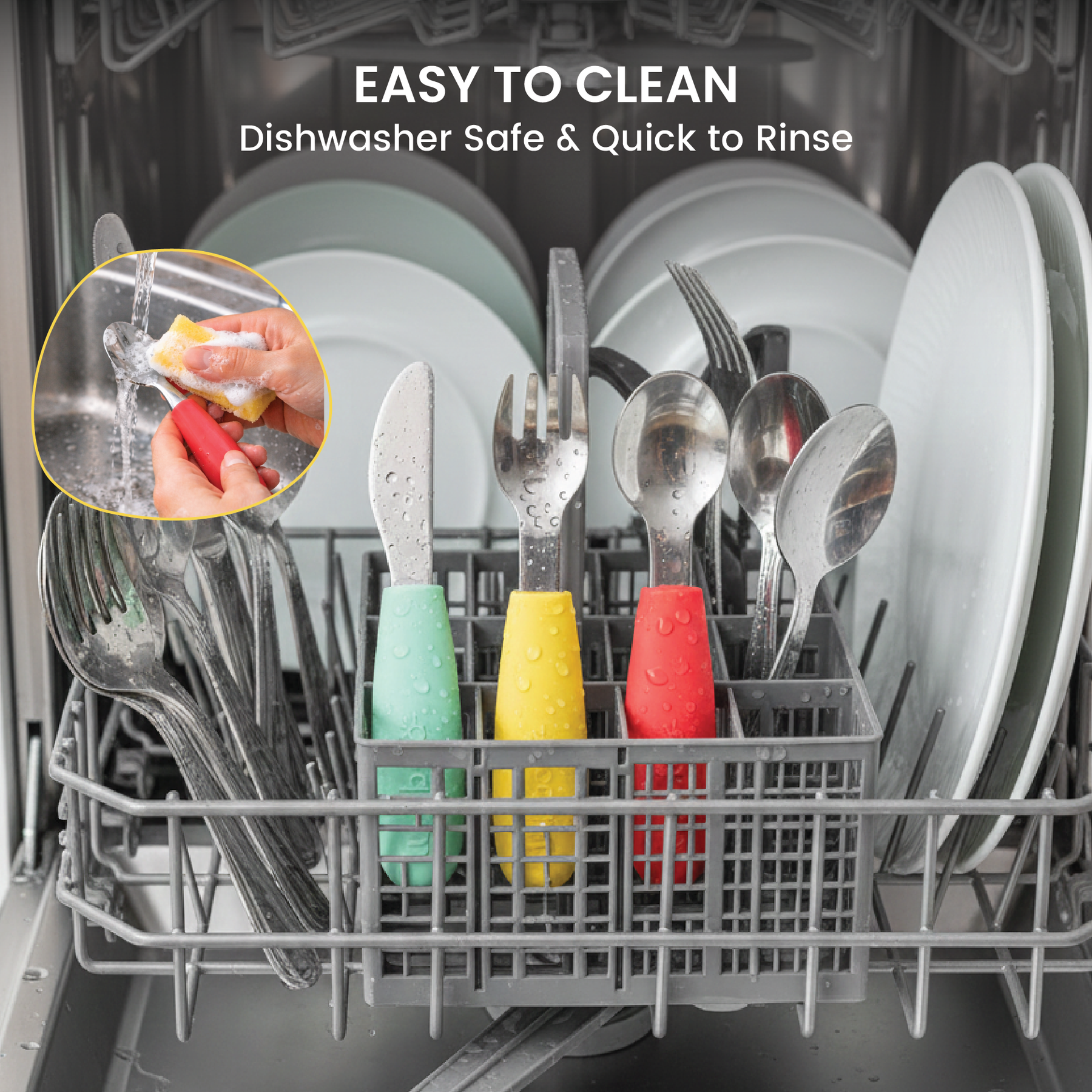 Help your toddler build confidence at the table with the Lulyboo Stainless Steel & Silicone Baby Cutlery Set. Thoughtfully designed for babies 6 months and up, this spoon, fork, and knife set supports early self-feeding skills with toddler-sized proportions and easy-grip silicone handles. Rounded stainless steel heads are made for everyday meals, while durable materials stand up to repeated use and cleaning. Dishwasher safe and practical for home or on-the-go feeding, this cutlery set is a simple, reliable addition to your child’s mealtime routine.