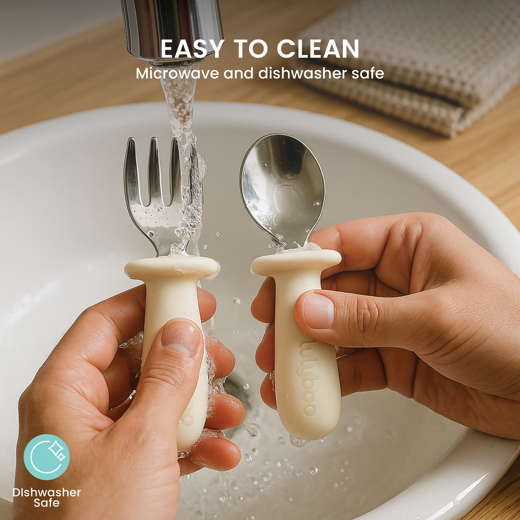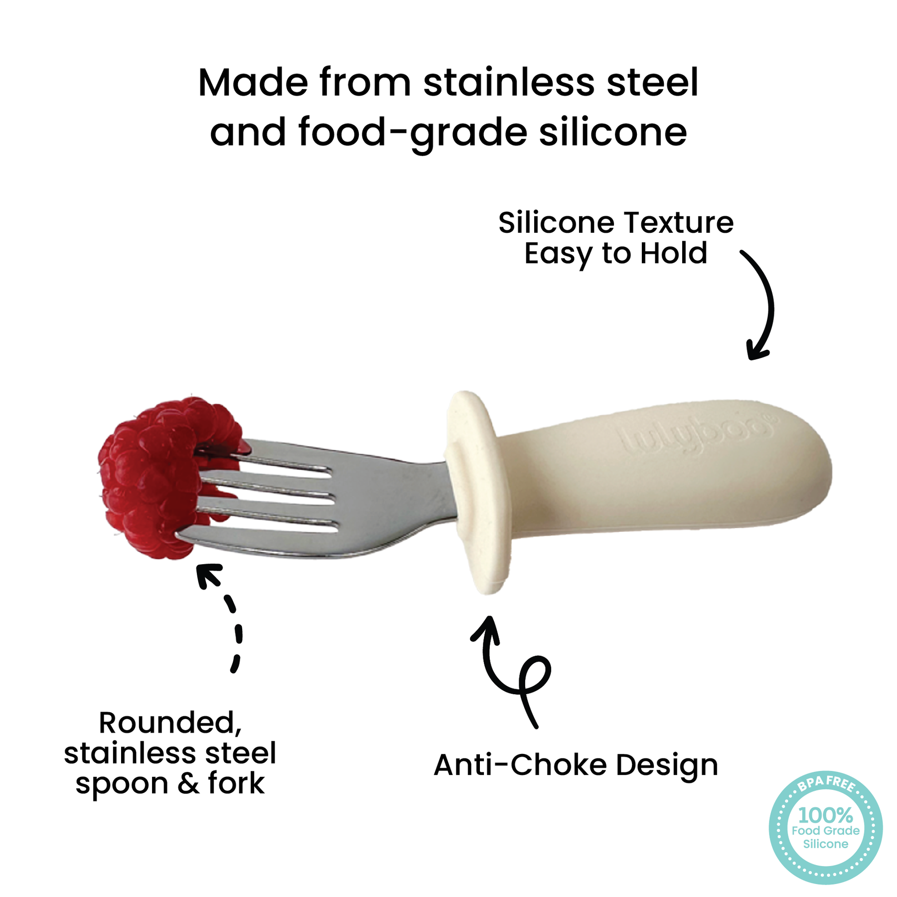 The handles are designed with a silicone stopper to prevent child from pushing fork or spoon too deep and provide as a safety feature.
