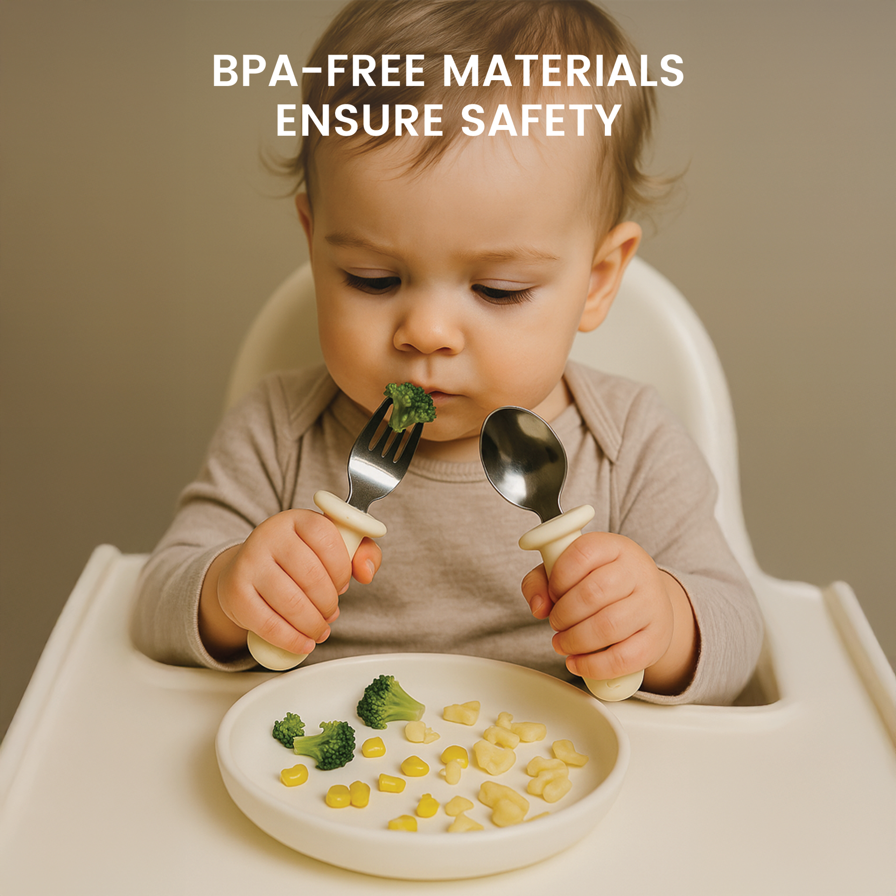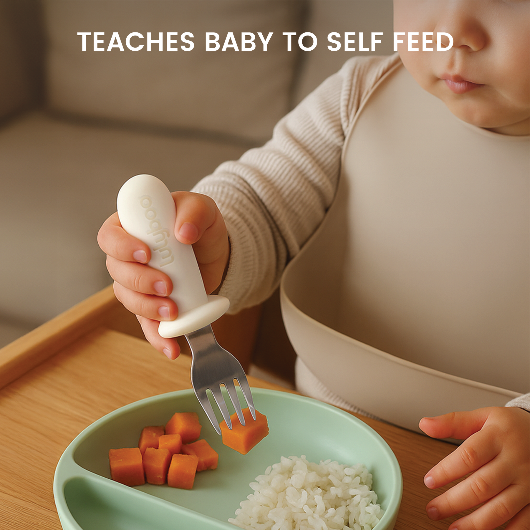 First stage feeding set with non-slip grip design with fat and round handle, for easy and convenient for toddlers to grasp
