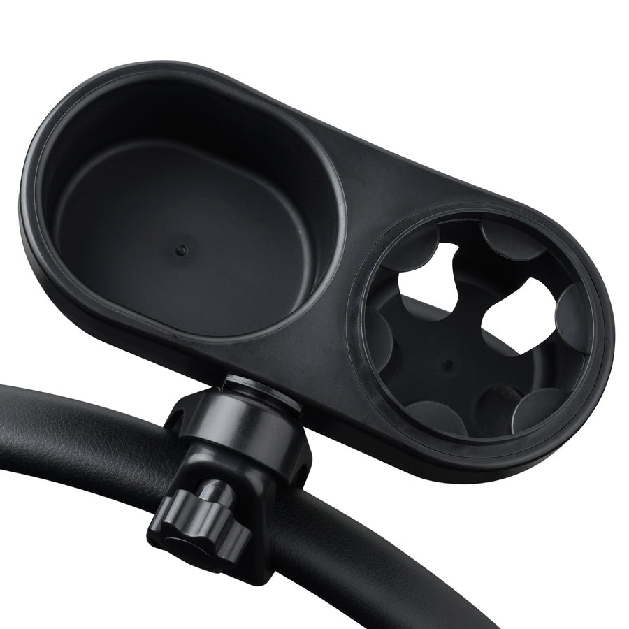 A built-in cup holder that securely holds bottles, sippy cups, or drinks, keeping them accessible for your child and preventing spills.