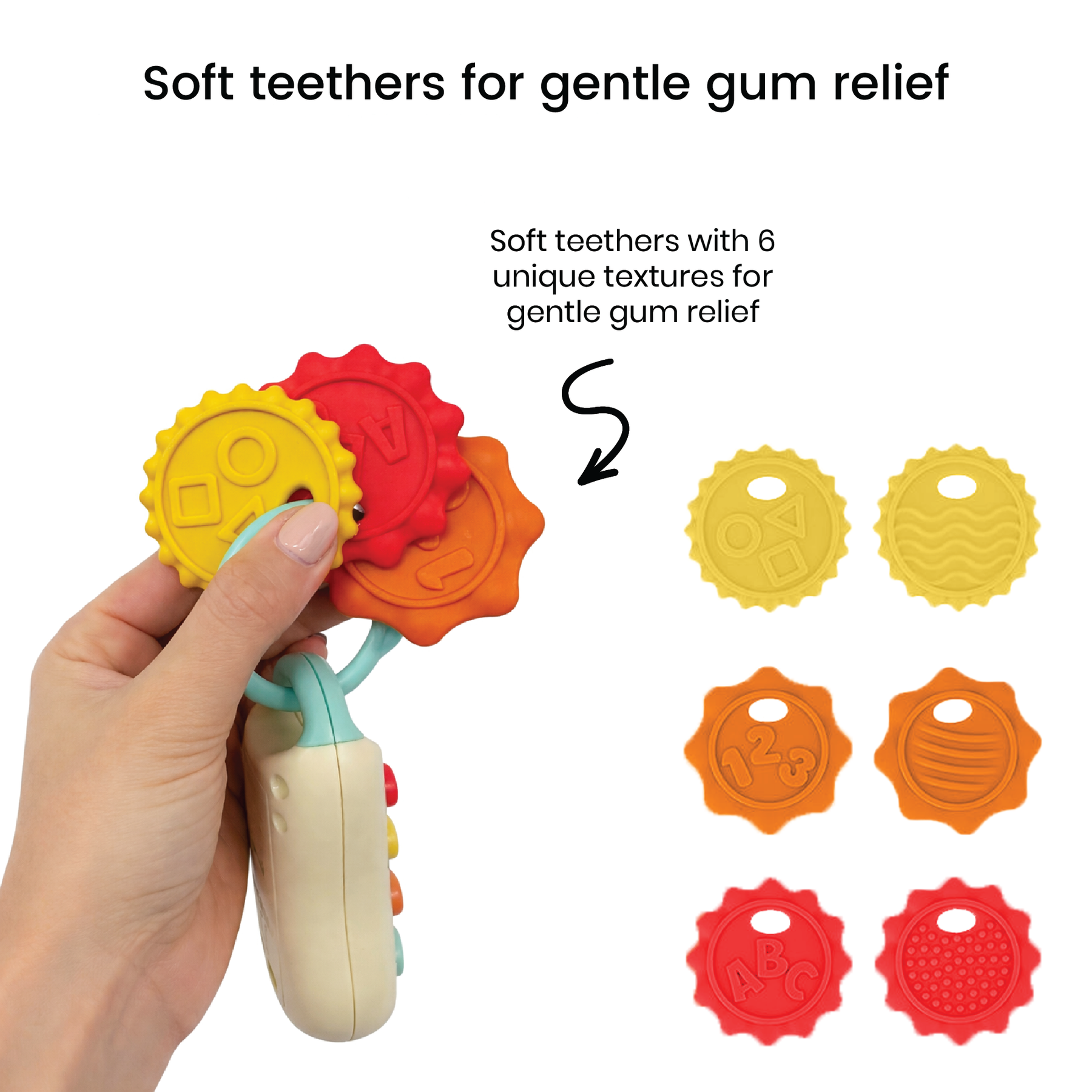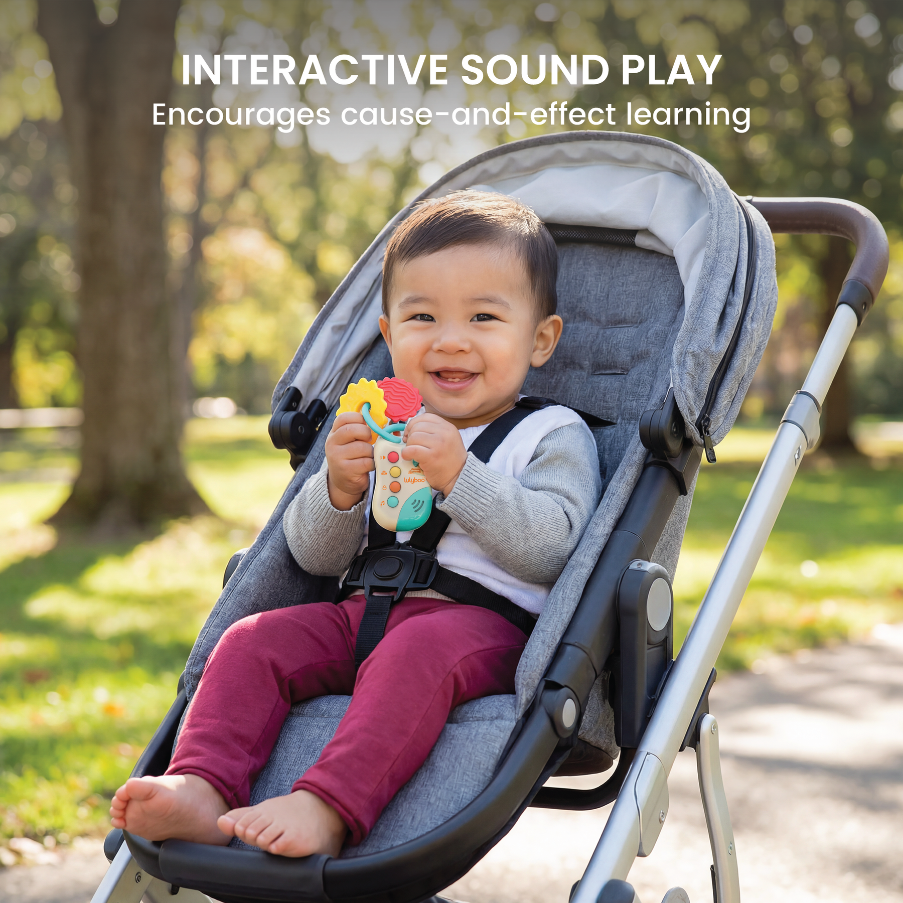 My First Teething Car Keys combines pretend play, sensory learning, and teething support in one engaging toy. Designed to look like real car keys, it features playful car sounds, a gentle lullaby, and a light-up button that responds to little presses. Removable silicone teether keys include multiple textures to support gentle gum relief while babies chew, grasp, and explore. The easy-to-hold size is ideal for tiny hands, helping build coordination and cause-and-effect understanding through everyday play. Made with BPA-free materials and batteries included, it is ready for fun at home or on the go. Always use under adult supervision.
