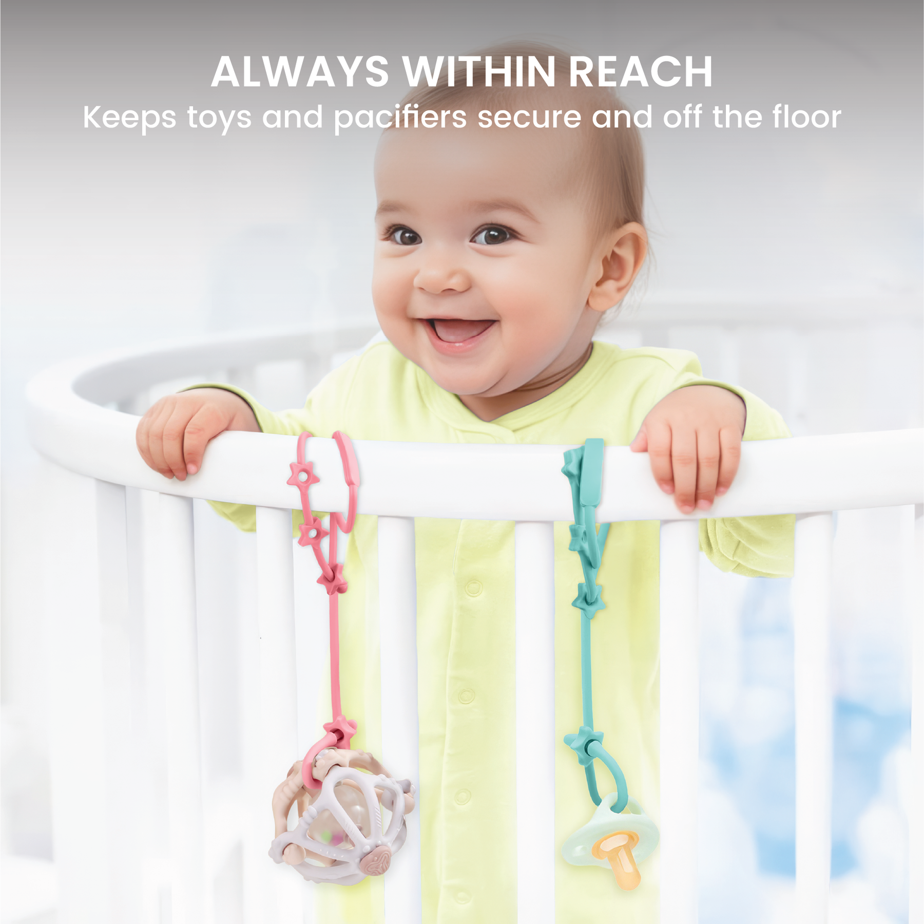Never chase another dropped bottle or toy again! Lulyboo’s Silicone Multi-Use Straps are your go-to helpers for keeping bottles, pacifiers, and toys off the floor and within baby’s reach. Designed with durable, food-grade silicone, they easily loop and fasten onto strollers, car seats, or high chairs. The flexible, wavy design adds style and security while making cleanup effortless. Available in three soft pastel shades, this 3-pack makes every trip neater and easier for parents on the go.