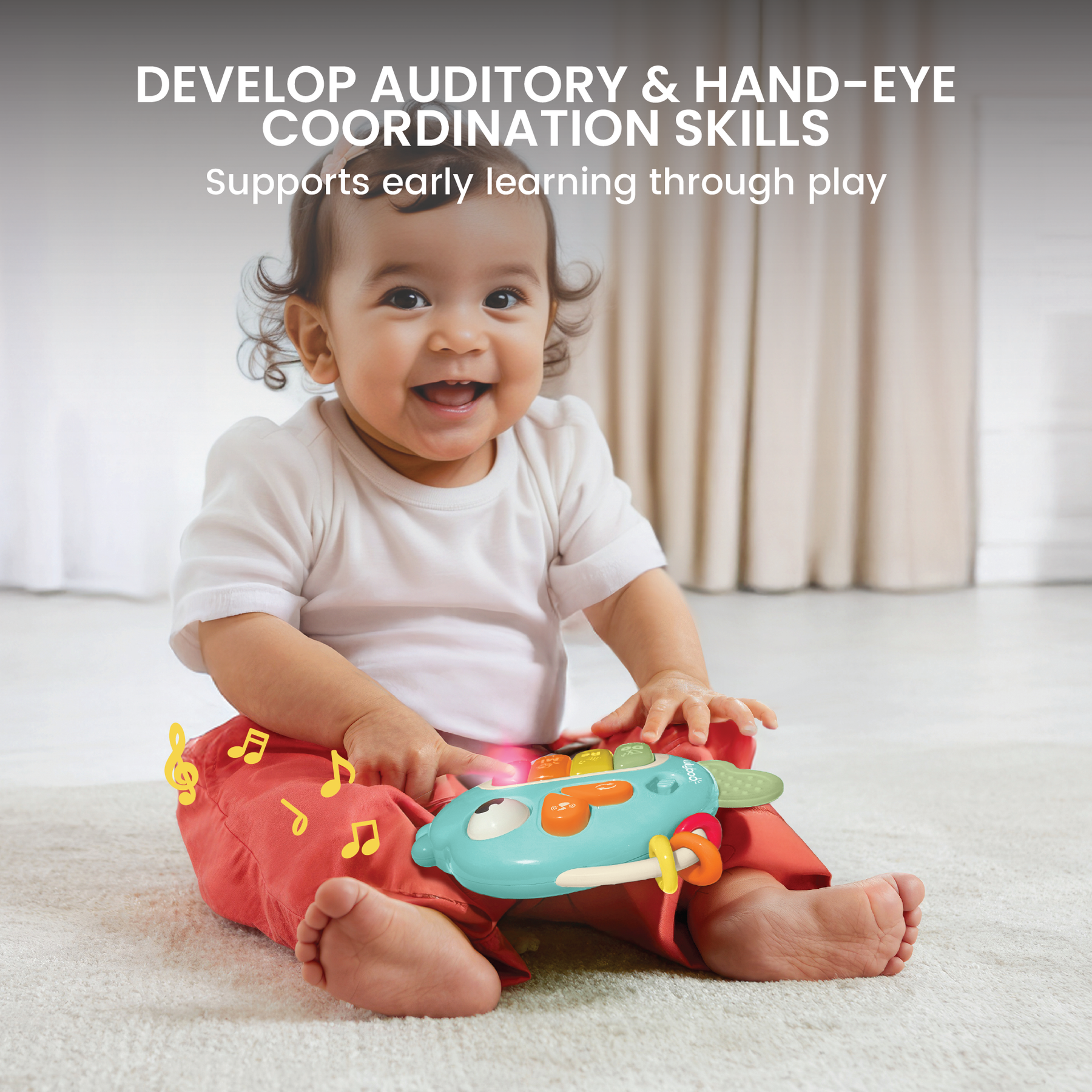 Soft-touch materials, rounded edges, and easy-grip details make it comfortable for little hands. Spinning rings and clickable elements help support fine motor development and hand-eye coordination. Batteries are included so the fun can start right away. A joyful, engaging toy that turns music into an early learning adventure.