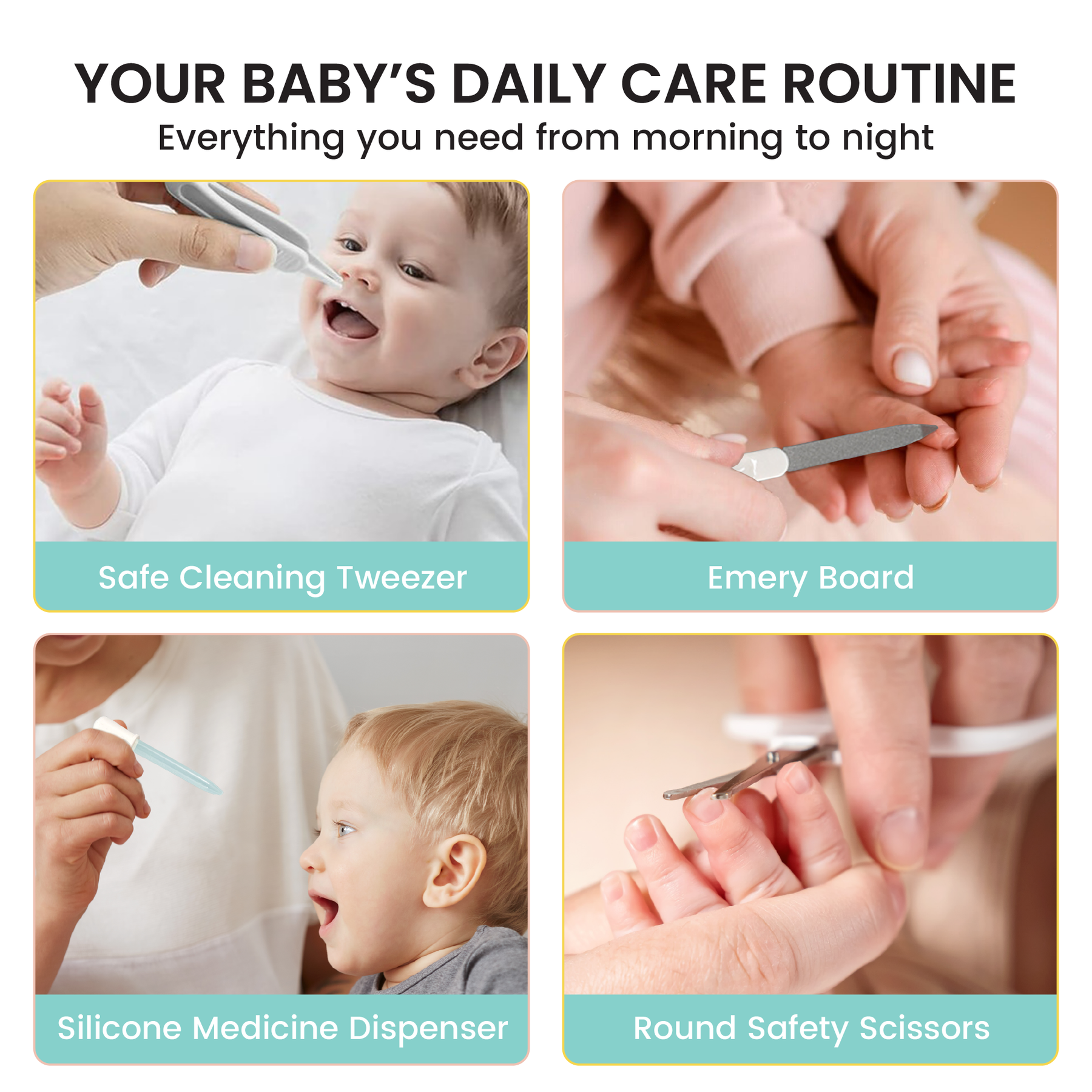 Features: Includes baby comb, baby brush, baby scissors, safe cleaning tweezer, 5 bandages, emery board, nail clipper, finger-tip gum stimulator, silicone medicine dispenser, nasal aspirator, and travel bag. Organized for portability, allowing you to take grooming essentials wherever you go. Meticulously crafted with safety and comfort in mind for a gentle grooming experience. Rigorously tested to meet the highest safety standards, ensuring peace of mind for parents.