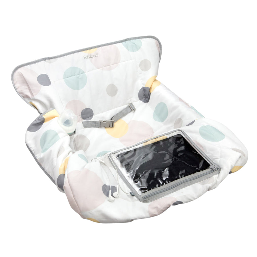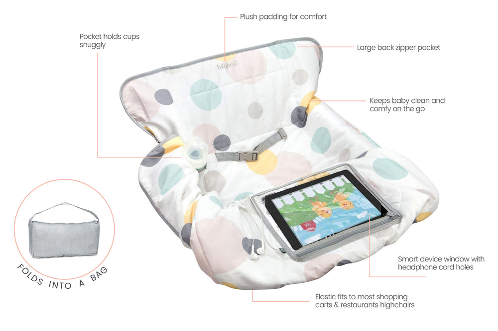 The Shopping Cart and Highchair Cover makes any shopping cart or high chair comfy and clean for your baby. Perfect for families on the go as it easily folds into its own pouch when not in use.