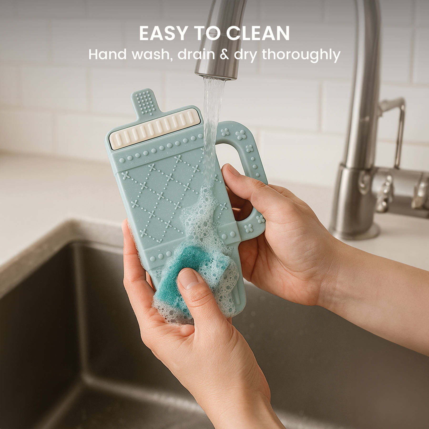Meet the Sip & Soothe Silicone Teether - an adorable smoothie-cup teether designed to bring comfort, relief, and sensory fun to your baby’s day. Made from soft, food-grade silicone , this teether features a mix of textures including bumps, ridges, and fruit-shaped impressions that gently massage sore gums. The ergonomic handle makes it easy for little hands to grasp, supporting early motor development and encouraging independent soothing. Lightweight, durable, and effortless to clean, it’s perfect for home, travel, or stroller time. A thoughtful blend of playful design and soothing function, Sip & Soothe quickly becomes a little one’s favorite companion.